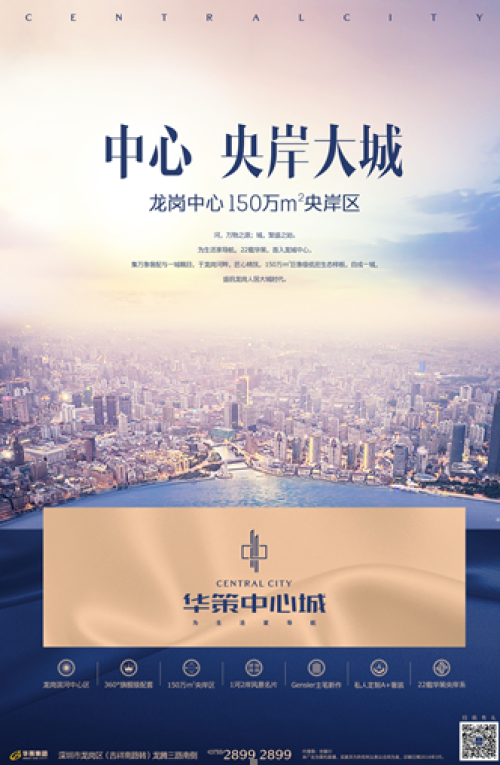 【華策中心城】位于龍崗中心城,緊鄰龍崗河,享一線河景資源。項目集住宅、寫字樓、公寓、商業等多項業態于一體,并規劃有幼兒園、學校及活動中心等文體配套,總建面達150萬平米,是片區內少有的超大體量城市綜合地產集群項目,也是深圳目前唯一一個百萬級濱河大盤,建成后,必將成為龍崗的標桿項目,引領片區人居生活方式的變革。