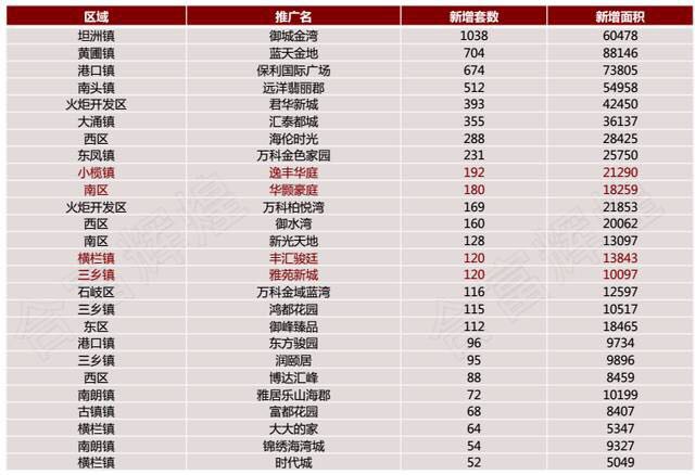 10月份共有26個項目新增,其中新增最多的是坦洲御城金灣1038套,黃圃鎮藍天金地花園和港口鎮保利國際廣場分別以704套和674套位列新增的第二和第三位。