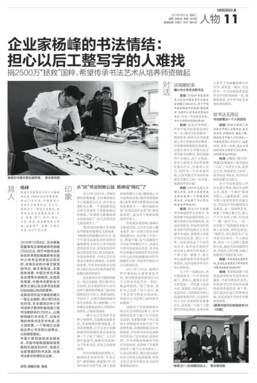 楊峰:其實(shí)并非突然,作為中國(guó)書法家協(xié)會(huì)的任何一員,都對(duì)書法有著非一般的熱衷。面對(duì)當(dāng)今書法課進(jìn)入中小學(xué)課堂舉步維艱,書法教師極度缺乏的現(xiàn)狀,以致許多中小學(xué)都無(wú)法正常開(kāi)展書法教學(xué)。我們都感到十分痛心,也十分焦慮,很多人都想為書法傳承事業(yè)做點(diǎn)什么,但都有心無(wú)力。而作為一個(gè)企業(yè)家的我,正好有能力為書法傳承事業(yè)貢獻(xiàn)自己的一份力量,我感到非常自豪。