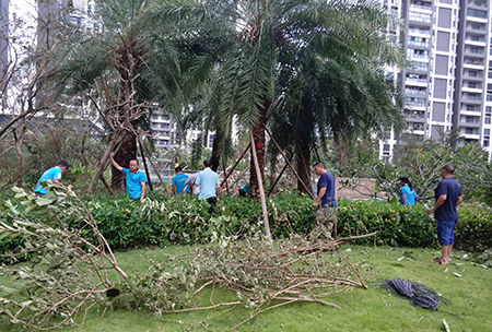 “天鴿”離開后,業主群里有人召集業主,呼吁大家一起當義工,組織開展清理小區及周邊道路倒伏樹木、廣告牌,盡早恢復小區原狀的行動。得知業主的請求后,小區物業公司安排了專門人員與業主共同開展行動,并提供了礦泉水、防割手套、清潔工具等用品。經過災難的洗禮,無論是物業工作人員,還是業主,大家心中都增添了幾分陽光。6棟業主“北極星”在微信群里說:“這次點贊下物業辛苦了,共建平安和諧小區,不斷進步。愿鄰居們都平安。”
