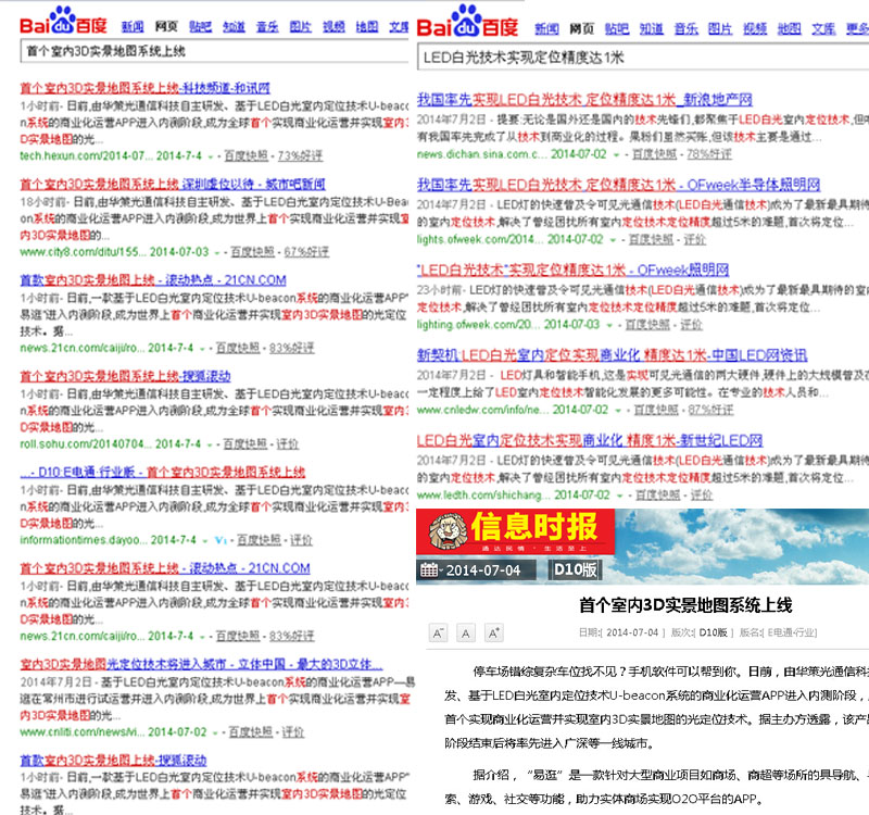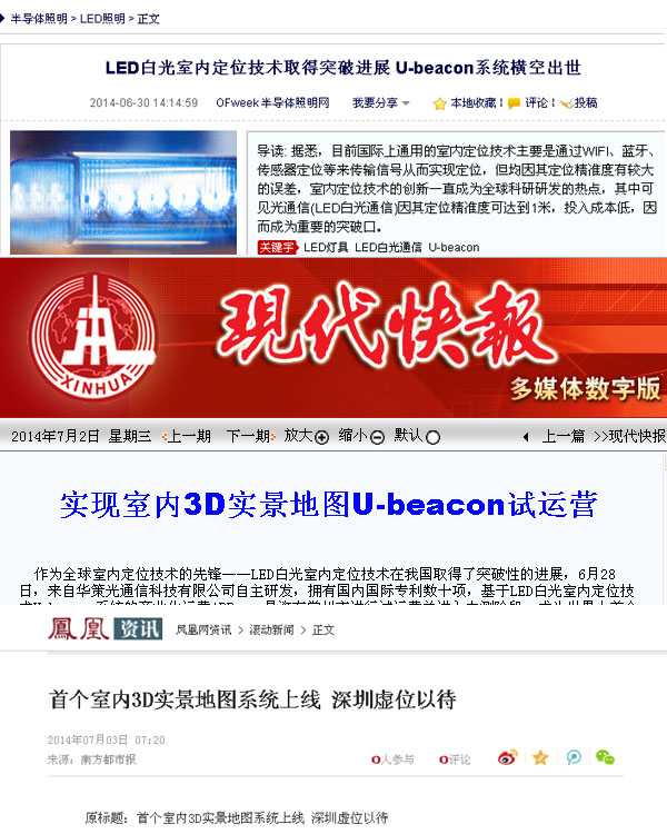 6月28日,來自華策光通信科技有限公司自主研發(fā),擁有國內(nèi)國際專利數(shù)十項,基于LED白光室內(nèi)定位技術(shù)U-beacon系統(tǒng)的商業(yè)化運營APP--“易逛”,在江蘇常州市進(jìn)行試運營并進(jìn)入內(nèi)測階段,成為世界上首個實現(xiàn)商業(yè)化運營并實現(xiàn)室內(nèi)3D實景地圖的光定位技術(shù)。據(jù)悉,該產(chǎn)品在內(nèi)測階段結(jié)束后將率先進(jìn)入廣深等一線城市,全面鋪開。該消息一經(jīng)報道,立刻引起廣泛關(guān)注。包括網(wǎng)易新聞、新浪財經(jīng)、鳳凰資訊、南方都市報、深圳晚報等數(shù)十家媒體爭相報道。