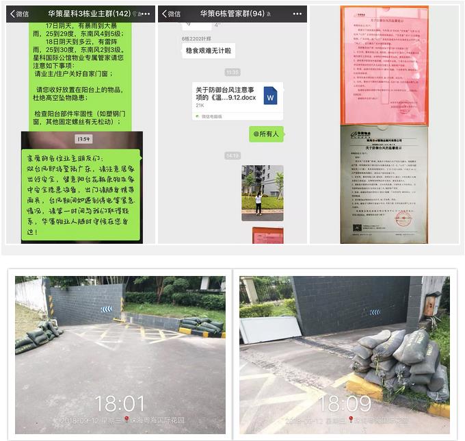 9月12日,華策旗下的嶺峰國際、龍騰灣、南灣國際、粵海國際、星科國際公館等各個小區的物業工作人員已經在電梯、大堂、公告欄等小區顯眼位置發布了防臺風的通知,提醒居民做好防風措施,同時各項目負責人通過電話、微信業主群、微信管家群緊急發布臺風預警公告。
