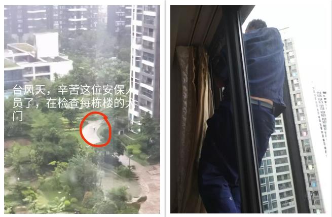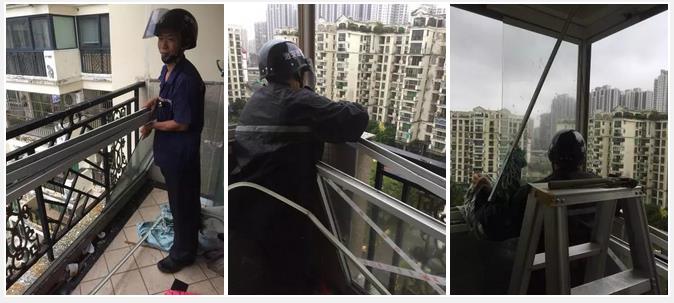 9月16日,臺風吹壞了19-904業主家陽臺玻璃,維修班長黎孟宗和維修工張建賓頂著大風大雨幫業主搶修