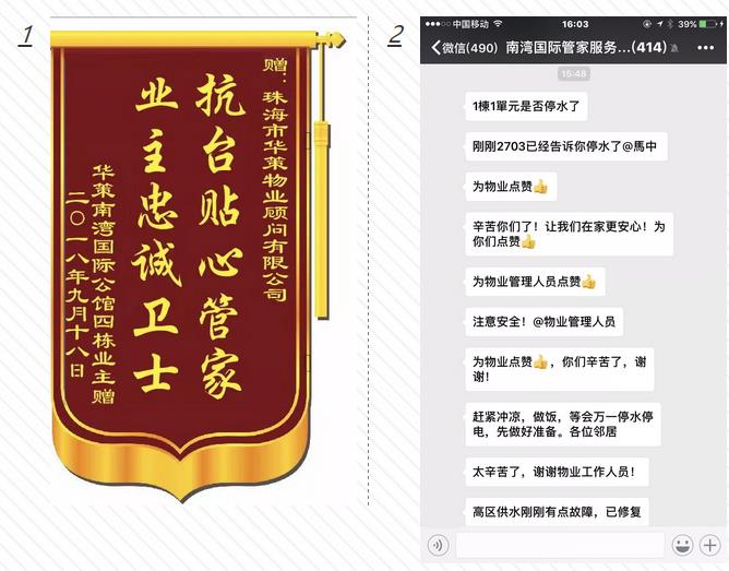 天災之下,華策物業人甘做臺風的逆行者,全力保障業主的生命財產安全,獲得了廣大業主的一致好評?!叭A策集團‘為生活家導航’這不只是一句服務話術,更不是工作中生硬的規定動作,而是每一個華策物業人,對客戶發自內心的‘真心告白’,我們只想在任何時候都確保所有業主心定心安?!比A策物業顧問有限公司副總經理徐彬說。