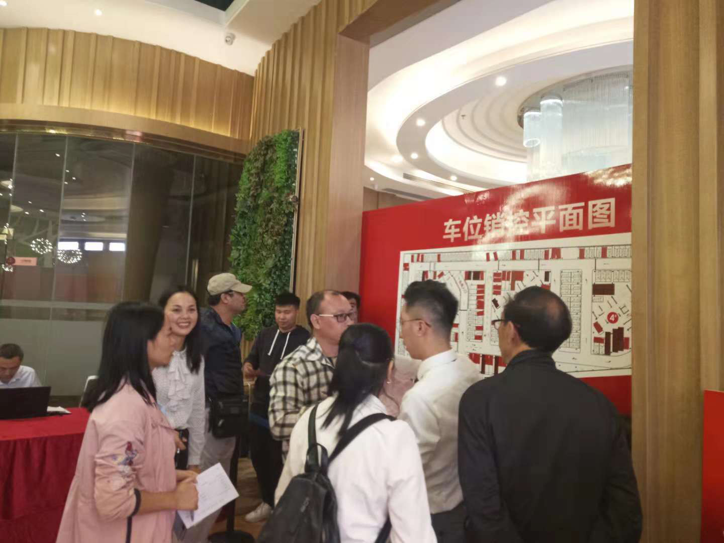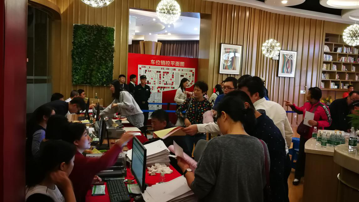 現(xiàn)場,一組一組的業(yè)主陸續(xù)進(jìn)入選車位區(qū),迅速搶定車位,把銷控區(qū)、財務(wù)區(qū)擠得水泄不通。工作人員忙得不可開交,不到兩個小時,車位銷控板迅速飚紅。