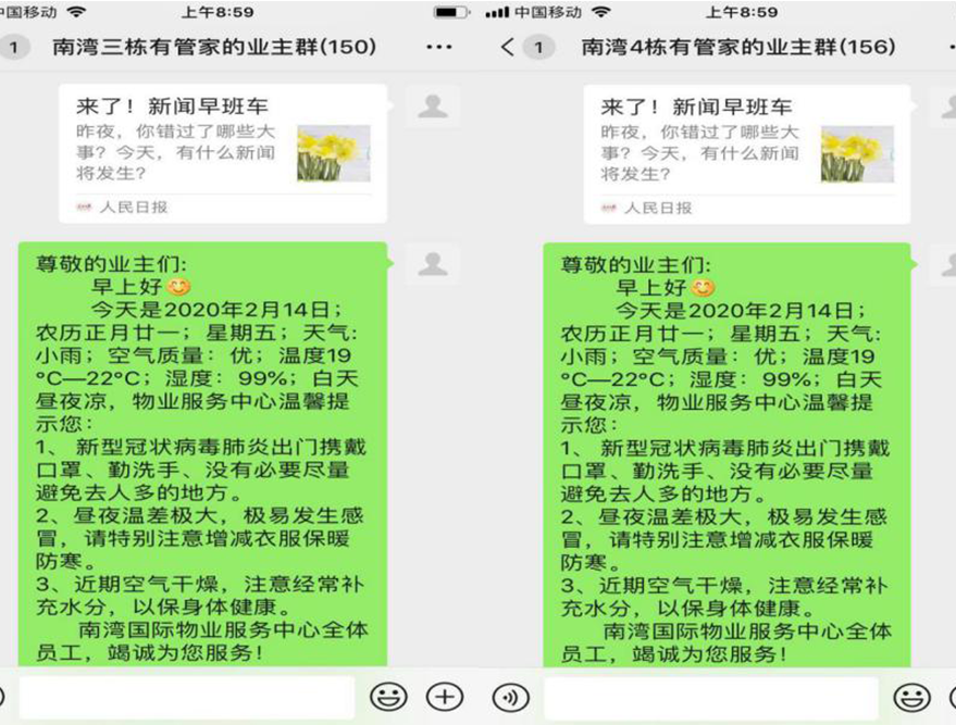 非常時期,健康人居成為每一個人安身立命之本,與疫情作戰就是在與時間賽跑。1月23日,大年二十九,“武漢封城”的信息傳來,自稱“小女生”的南灣國際公館物業項目副經理王萍萍看著不斷被疫情刷新的微信群信息,心頭一緊,在收到疫情防控的工作要求后更是心慌意亂,不知如何是好,著急得哭了起來。過了一會,王萍萍想了想,小區7棟居民樓的共計1485多居民的健康可不是小事,作為春節期間的物業負責人,在物業其他領導因疫情防控,暫時不能回來的情況下,必須獨自撐起來。