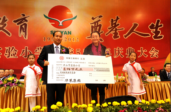2012年12月22日,在中山市實(shí)驗(yàn)小學(xué)舉行建校55周年慶祝大會(huì)上,集團(tuán)公司向中山市實(shí)驗(yàn)小學(xué)捐款100萬(wàn)元人民幣助學(xué)興教。圖為集團(tuán)行政總監(jiān)趙日云(右)向中山市實(shí)驗(yàn)小學(xué)校長(zhǎng)劉道康(左)捐贈(zèng)放大的100萬(wàn)元銀行支票。